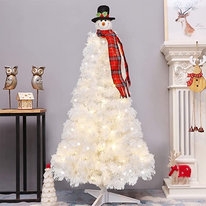 Package Includes: 1 x White Christmas Tree, 1 x Snowman Tree Topper, 3 x Plastic Tree Stand